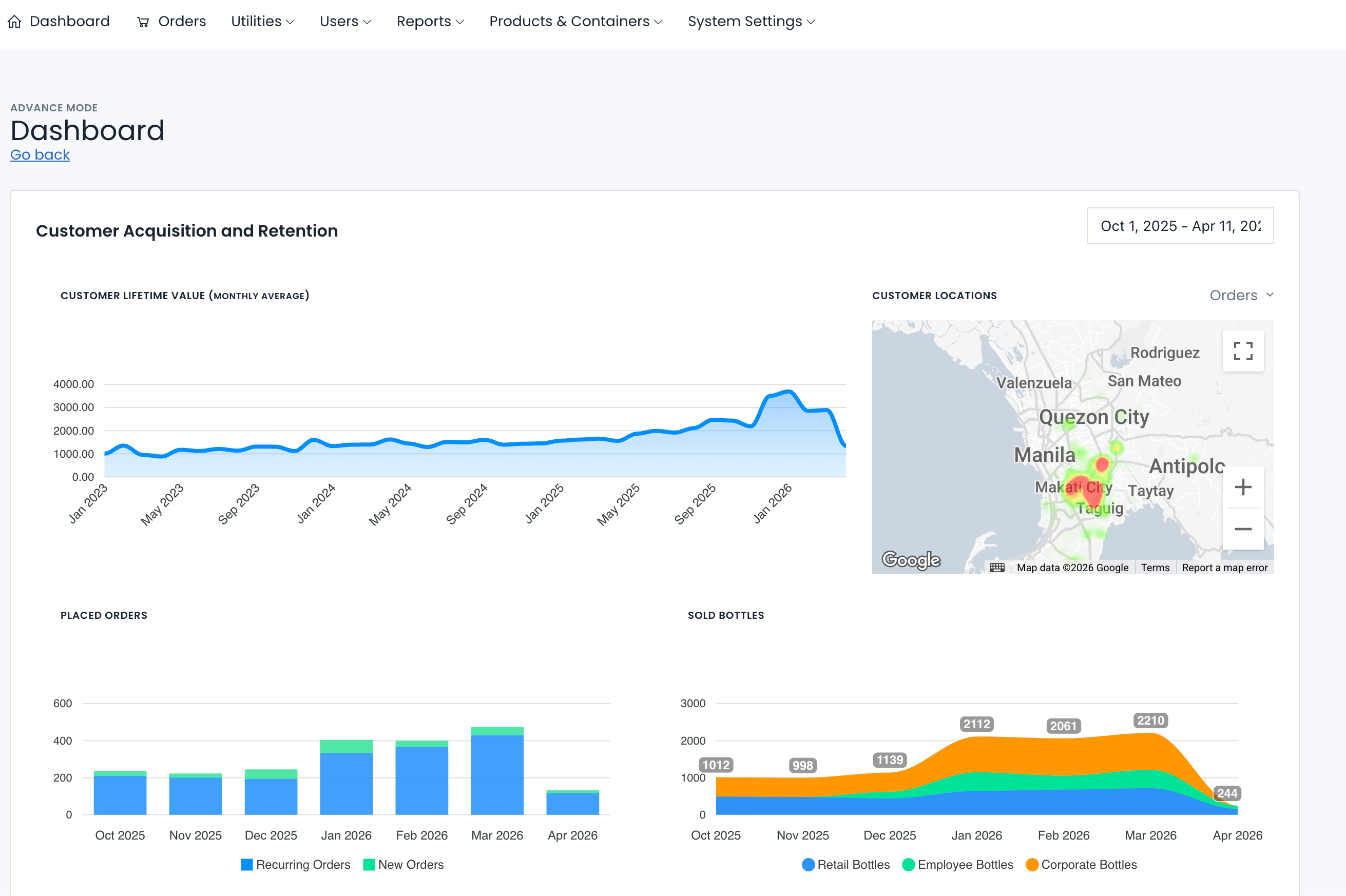 Corporate clients, companies and embassies tied to a preferred supplier, with billing consolidated to the company rather than per employee. Billing and invoicing covers supplier statements, sales invoices, service fees, and potability reports with downloadable PDFs per entry. The service area map plots delivery zones as polygons across Metro Manila so coverage gaps are visible at a glance. Analytics runs in two modes, quick summary or advanced chart breakdowns covering acquisition, retention, CLV, orders by channel, supplier growth, and delivery performance.